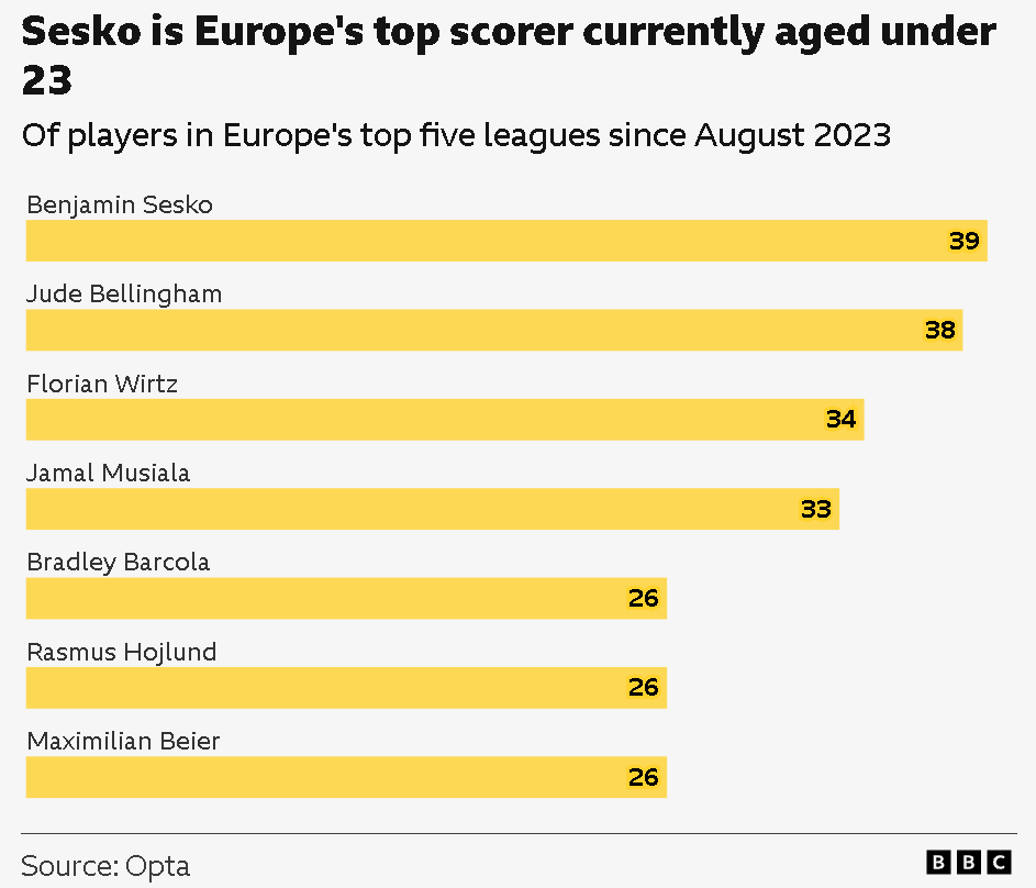 在得分 数方面,2022年夏季转会到莱比锡之后,他在87场赛事 打入39球,外加8次助功 。其中,德甲64场打入27球,有6球在欧冠取得。这让他成为欧洲五大职业联赛 23岁以下球员中的头号射手,比皇家马德里的贝林厄姆多1球,比刚加盟利物浦的1亿英镑先生维尔茨多5球。