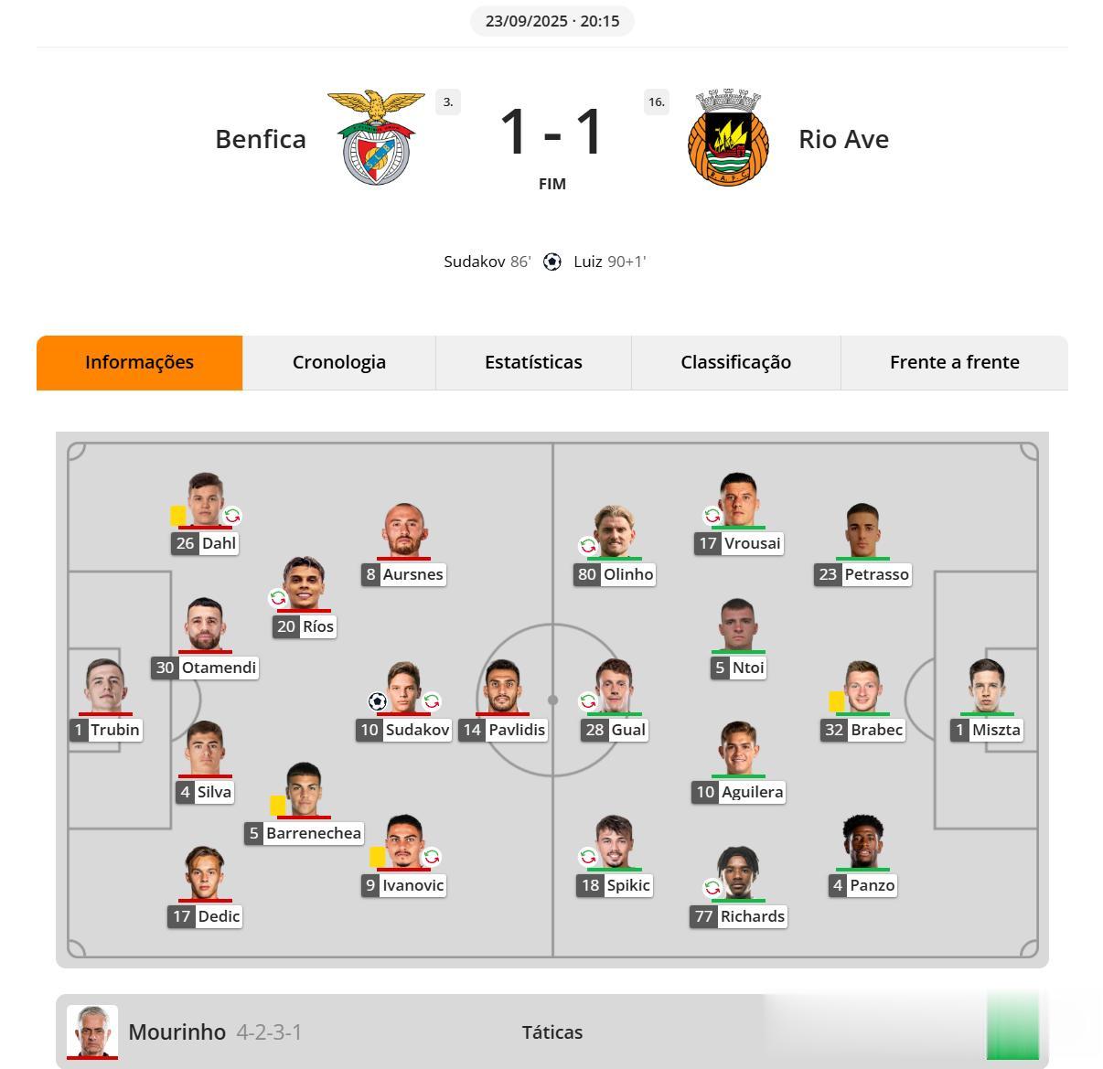 穆里尼奥首秀本菲卡,没能赢球,主场作战 只能1-1打平里奥阿维,与毕尔巴的1-1算是两个冷门。