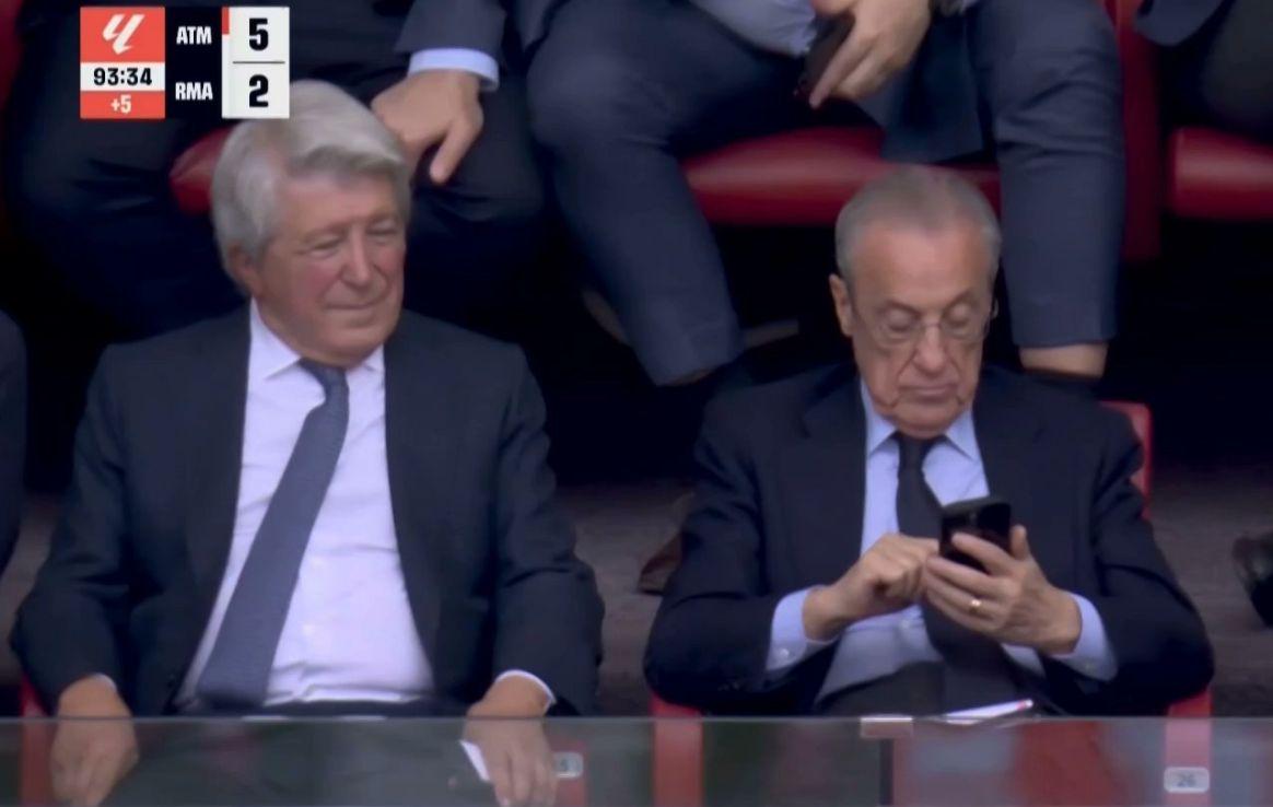 当格里兹曼将比分锁定为2-5的时候,英超免费高清直播镜头给到了看台上的弗洛伦蒂诺。与马竞主席坐在一起,弗洛伦蒂诺脸色铁青,玩手机掩饰尴尬,没有与旁边人说任何话。估计,他赛后要在更衣室里训话。