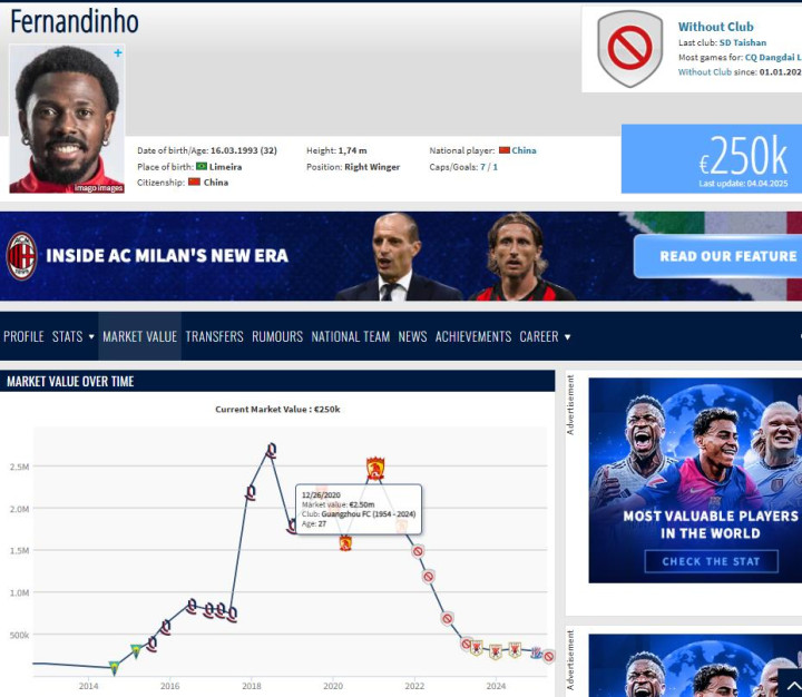 第三个,虽然身在巴西,但费南多依然保留中国国籍。他的社交媒体简介依旧写着“中国古代足球 运动活动 员”,甚至挂着中文名字“费南多”。这意味着,如果未来有俱乐部愿意接纳,他依然能以“归化球员”的身份加盟,不占外援名额。可惜的是,去年他与泰山闹翻,又狮子大开口向申花索要200万欧年薪被拒,如今在中国球迷眼里,他几乎已经被贴上“最失败归化”的标签。