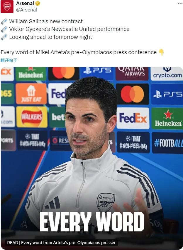 阿尔特塔在赛前新闻发布会上谈到了球队的受伤 问题。