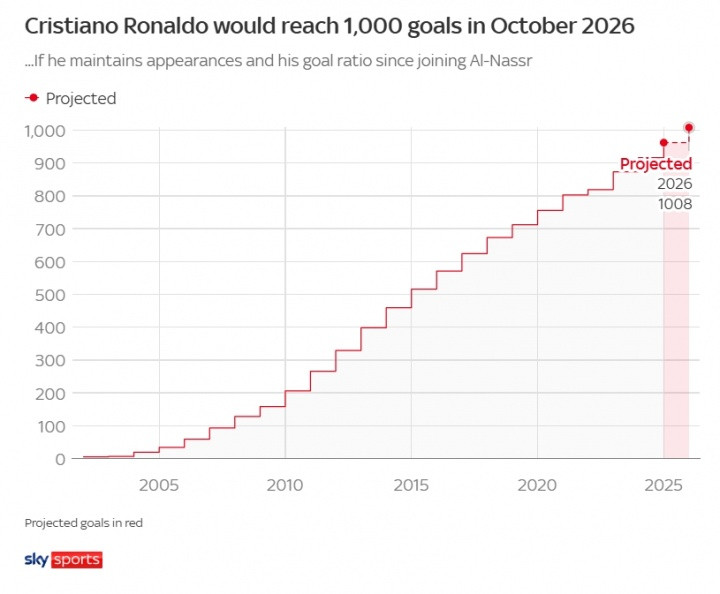 天空体育最新的预测显示,根据C罗目前的得分 效率,他预计将在2026年10月成为历史上第一位得分 数达到1000的球员。