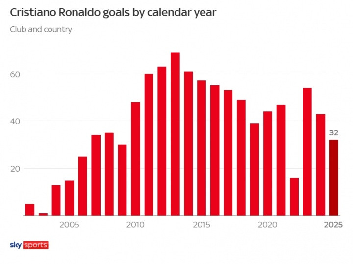 2025年,178足球直播官网C罗已经在俱乐部和国家队攻入32球,自2010年以来,C罗平均每年得分 数超过50个,过去15年里,他的年度总得分 数只有一次低于39个。那是在2022年,那一年他攻入了16粒得分 。