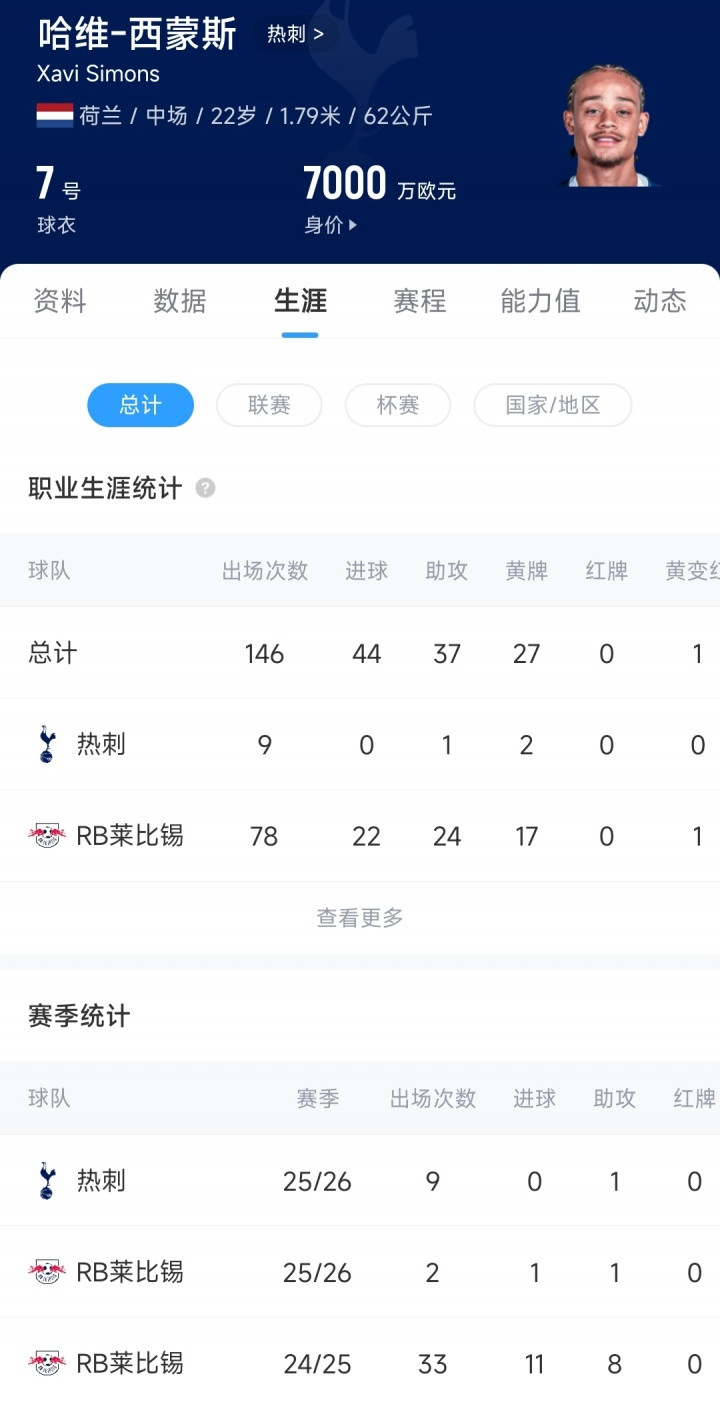 今年夏窗,热刺花费6500万欧元,从RB莱比锡签下哈维-西蒙斯,哈维-西蒙斯与热刺签下了一份5年的合同,周薪19.5万英镑。目前22岁的西蒙斯德回转 价为7000万欧元。