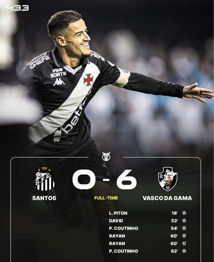 今天凌晨,巴甲第20轮赛事 ,桑托斯在主场作战 0-6大败 给瓦斯科达伽马,库蒂尼奥连进两球,内马尔哑火。